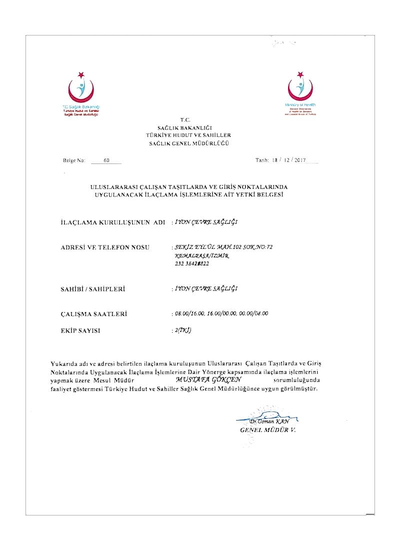Uluslararası Taşıtlar ve Giriş Noktaları İlaçlama Yetki Belgesi Uluslararası Taşıtlar ve Giriş Noktaları İlaçlama Yetki Belgesi -
